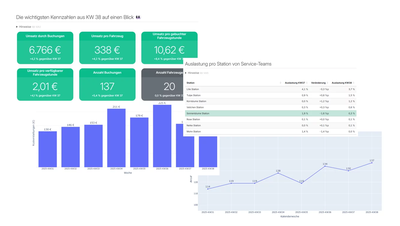 • Wöchentliche Umsätze der letzten 8 Wochen – gesamt, pro Fahrzeug, pro Station, pro Team, nach Preiskomponente sowie pro gebuchter Fahrzeugstunde